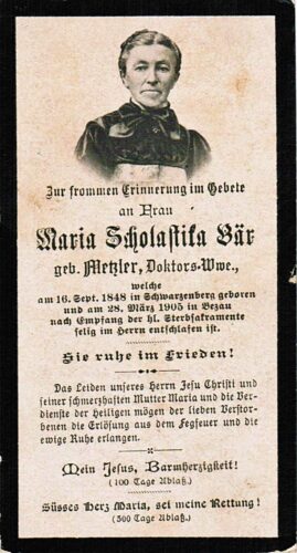 Vorheriges BildNächstes Bild Baer Maria Scholastika, geb. Metzler, 16.9.1848 Schwarzenberg – 28.3.1905 Bezau