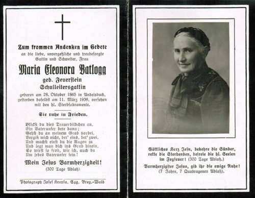 Vorheriges BildNächstes Bild Batlogg Maria Eleonora, geb. Feuerstein, 28.10.1865 – 11.3.1936 Andelsbuch