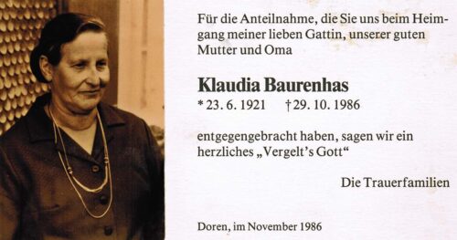 Vorheriges BildNächstes Bild Baurenhas Klaudia, geb. Heidegger, 23.6.1921 Schwarzenberg – 29.10.1986 Doren
