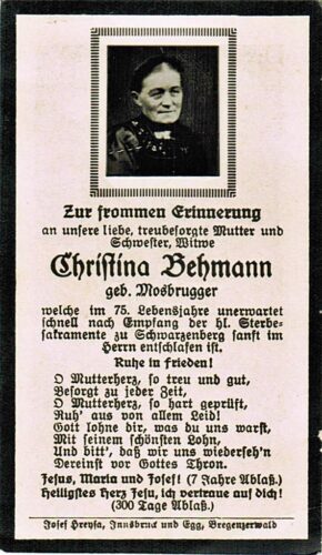 Vorheriges BildNächstes Bild Behmann Christina, geb. Moosbrugger, 23.2.1855 Reuthe – 11.12.1929 Schwarzenberg