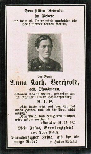 Vorheriges BildNächstes Bild Berchtold Anna Katharina, geb. Moosmann, 5.1.1865 Reuthe – 11.1.1918 Schwarzenberg