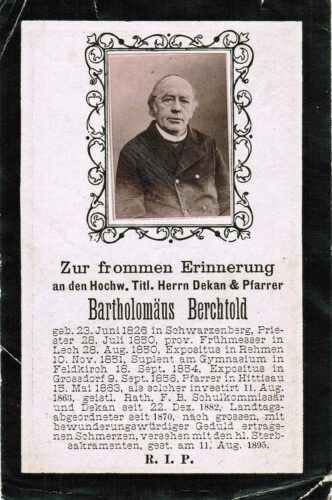 Vorheriges BildNächstes Bild Berchtold Bartholomaeus, Priester, 23.6.1826 Schwarzenberg – 11.8.1895 Hittisau