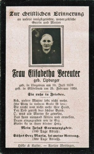 Vorheriges BildNächstes Bild Bereuter Elisabetha, geb. Lipburger, 10.7.1870 Lingenau – 25.2.1924 Alberschwende
