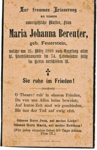 Vorheriges BildNächstes Bild Bereuter Maria Johanna, geb. Feuerstein, 12.7.1814 Bezau – 21.3.188 Andelsbuch