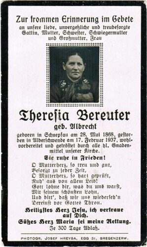 Vorheriges BildNächstes Bild Bereuter Theresia, geb. Albrecht, 6.6.1868 Schnepfau – 17.2.1937 Alberschwende