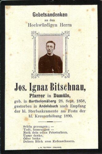 Vorheriges BildNächstes Bild Bitschnau Josef Ignaz, Priester, 28.9.1858 Bartholomaeberg – 14.9.1890 Andelsbuch