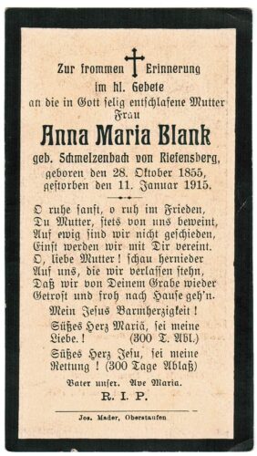 Vorheriges BildNächstes Bild Blank Anna Maria, geb. Schmelzenbach, 28.10.1855 Riefensberg – 11.1.1915 Sulzberg