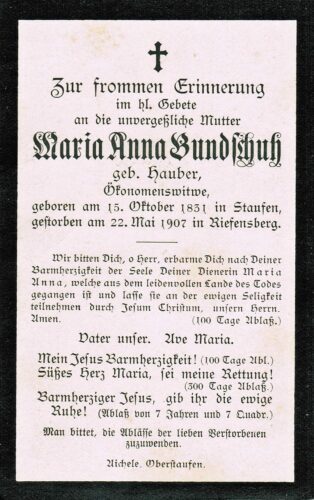 Vorheriges BildNächstes Bild Bundschuh Maria Anna, geb. Hauber, 15.10.1831 Staufen – 22.5.1907 Riefensberg