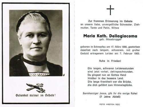 Vorheriges BildNächstes Bild Dellagiacoma Maria Katharina, geb. Moosbrugger, 17.3.1886 – 7.2.1963 Schnepfau