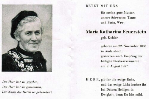 Vorheriges BildNächstes Bild Feuerstein Maria Katharina, geb. Kohler, 22.11.1888 – 9.8.1957 Andelsbuch