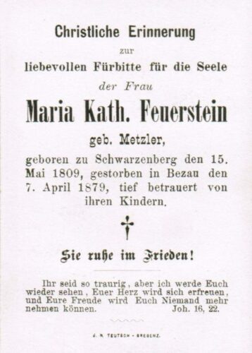 Vorheriges BildNächstes Bild Feuerstein Maria Katharina, geb. Metzler, 15.5.1809 Schwarzenberg – 7.4.1879 Bezau