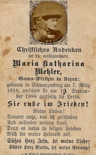 Vorheriges BildNächstes Bild Feuerstein Maria Katharina, geb. Metzler, 7.3.1818 Schwarzenberg – 19.9.1888 Bezau