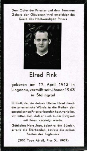 Vorheriges BildNächstes Bild Fink Michael Josef, Pater Elred, 17.4.1912 Lingenau – Jänner 1943 Stalingrad
