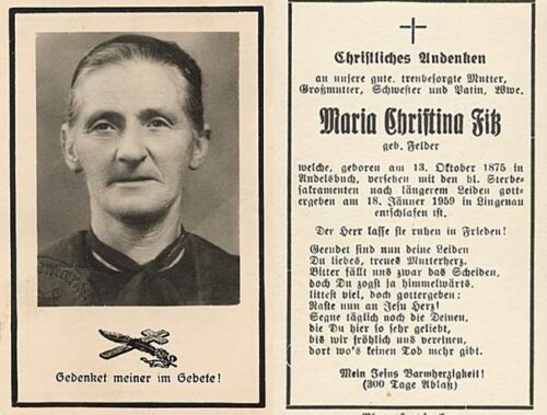 Vorheriges BildNächstes Bild Fitz Maria Christina, geb. Felder, 13.10.1875 Andelsbuch – 18.1.1959 Reuthe
