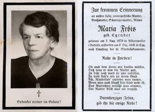Vorheriges BildNächstes Bild Froeis Maria, geb. Egender, 5.8.1879 Albersweiler, Baden – 8.12.1945 Egg