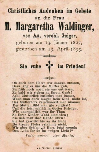 Vorheriges BildNächstes Bild Geiger Maria Margaretha, geb. Waldinger, 13.1.1827 Andelsbuch – 13.4.1893 Au