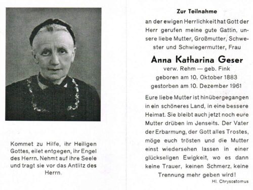 Vorheriges BildNächstes Bild Geser Anna Katharina, geb. Fink, verw. Rehm, 10.10.1883 Lingenau – 10.12.1961 Egg