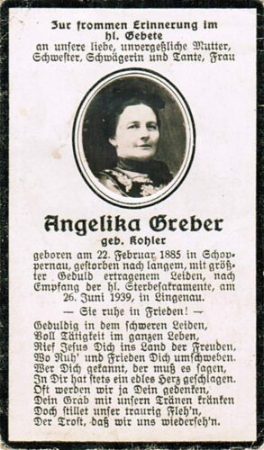 Vorheriges BildNächstes Bild Greber Angelika, geb. Kohler, 22.2.1885 Schoppernau – 26.6.1939 Lingenau