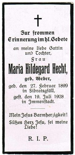 Vorheriges BildNächstes Bild Hecht Maria Hildegard, geb. Weber, 27.2.1899 Sibratsgfaell – 19.7.1928 Immenstadt