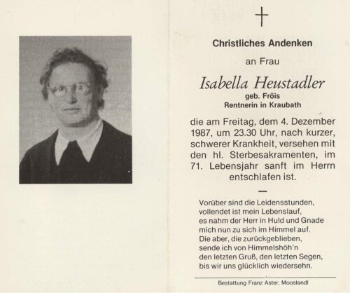 Vorheriges BildNächstes Bild Heustadler Isabella, geb. Froeis-Ruescher, 2.8.1917 Krippau – 4.12.1987 Kraubath