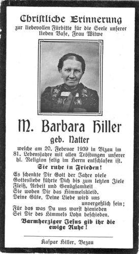 Vorheriges BildNächstes Bild Hiller Maria Barbara, geb. Natter, verw. Pfefferkorn, 10.8.1858 – 20.2.1939 Bizau