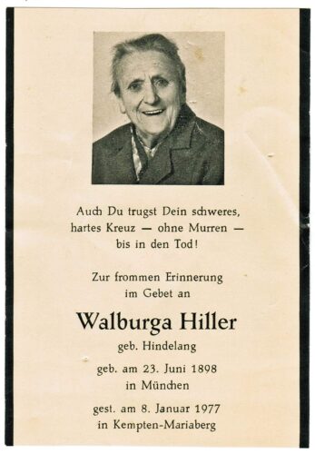 Vorheriges BildNächstes Bild Hiller Walburga, geb. Hindelang, 23.6.1898 Muenchen – Bezau – 8.1.1977 Kempten