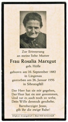 Vorheriges BildNächstes Bild Marxgut Rosalia, geb. Hoefle, 23.9.1882 Lingenau – 28.1.1956 Sibratsgfaell