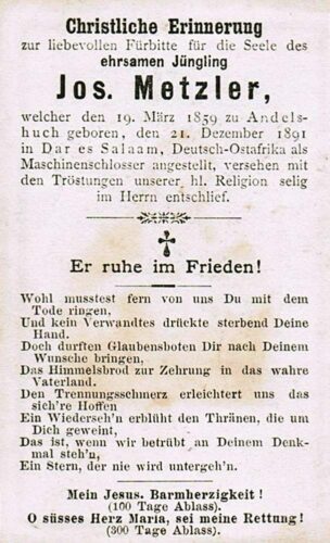 Vorheriges BildNächstes Bild Metzler Josef Ignaz, 18.3.1859 Andelsbuch – 21.12.1891 Dar es Salaam, Tansania