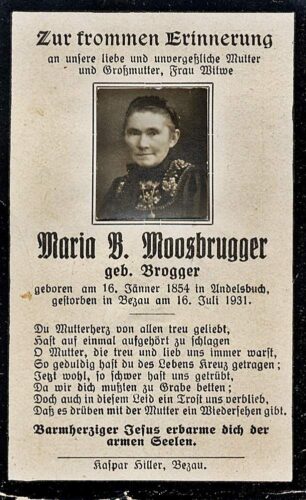 Vorheriges BildNächstes Bild Moosbrugger Maria B., geb. Broger, 16.1.1854 Andelsbuch – 16.7.1931 Bezau