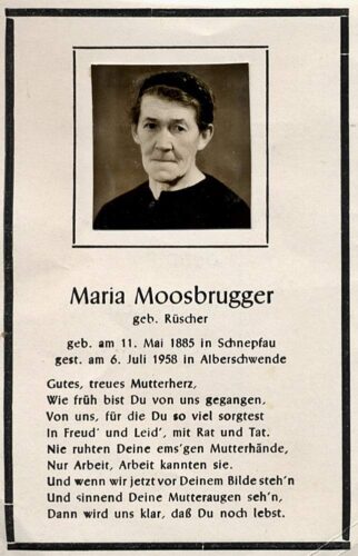 Vorheriges BildNächstes Bild Moosbrugger Maria, geb. Ruescher, 11.5.1885 Schnepfau – 6.7.1958 Alberschwende