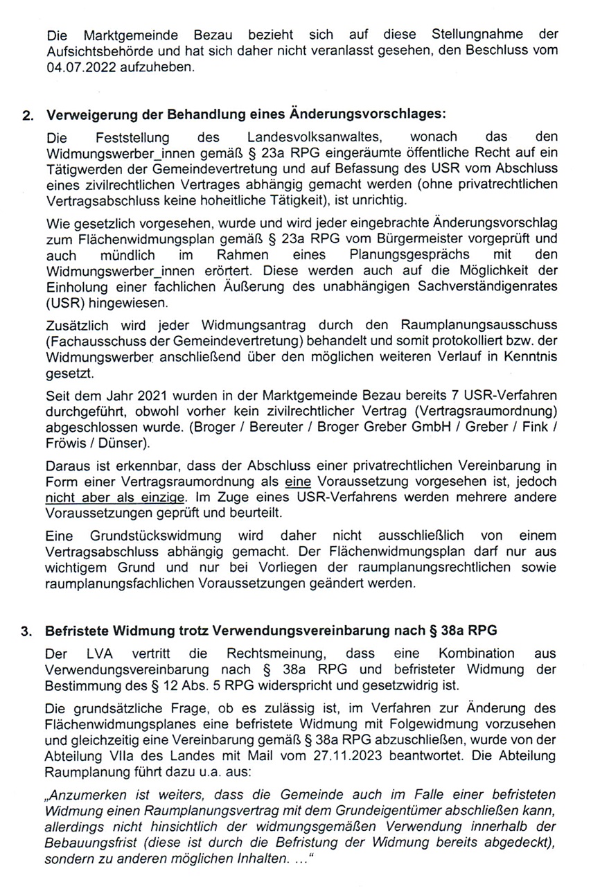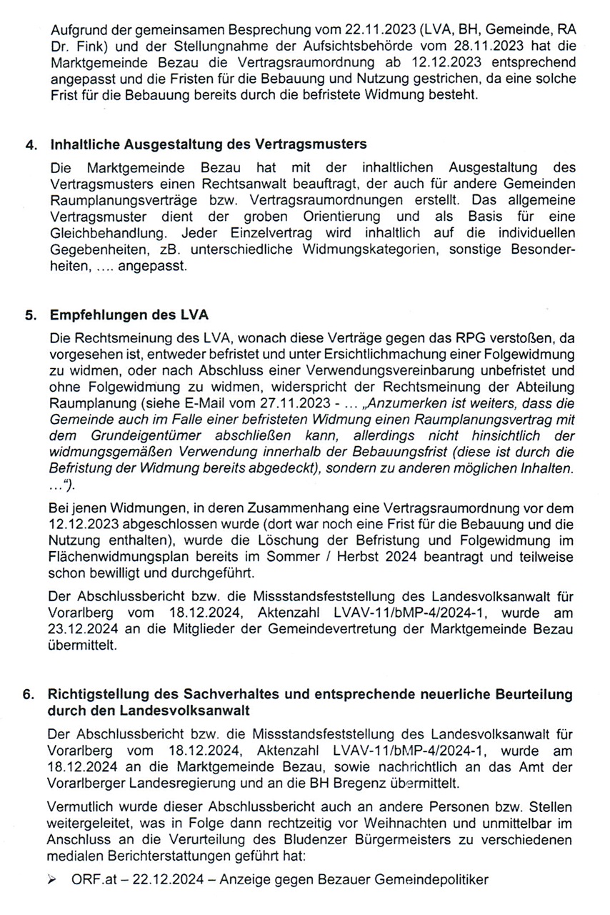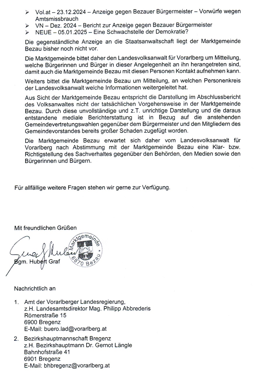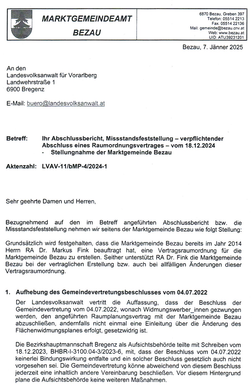 Stellungnahme MGde Bezau Stellungnahme der Marktgemeinde Bezau zum Abschlussbericht (Missstandsfeststellung) des Landesvolksanwaltes vom 18.12.2024