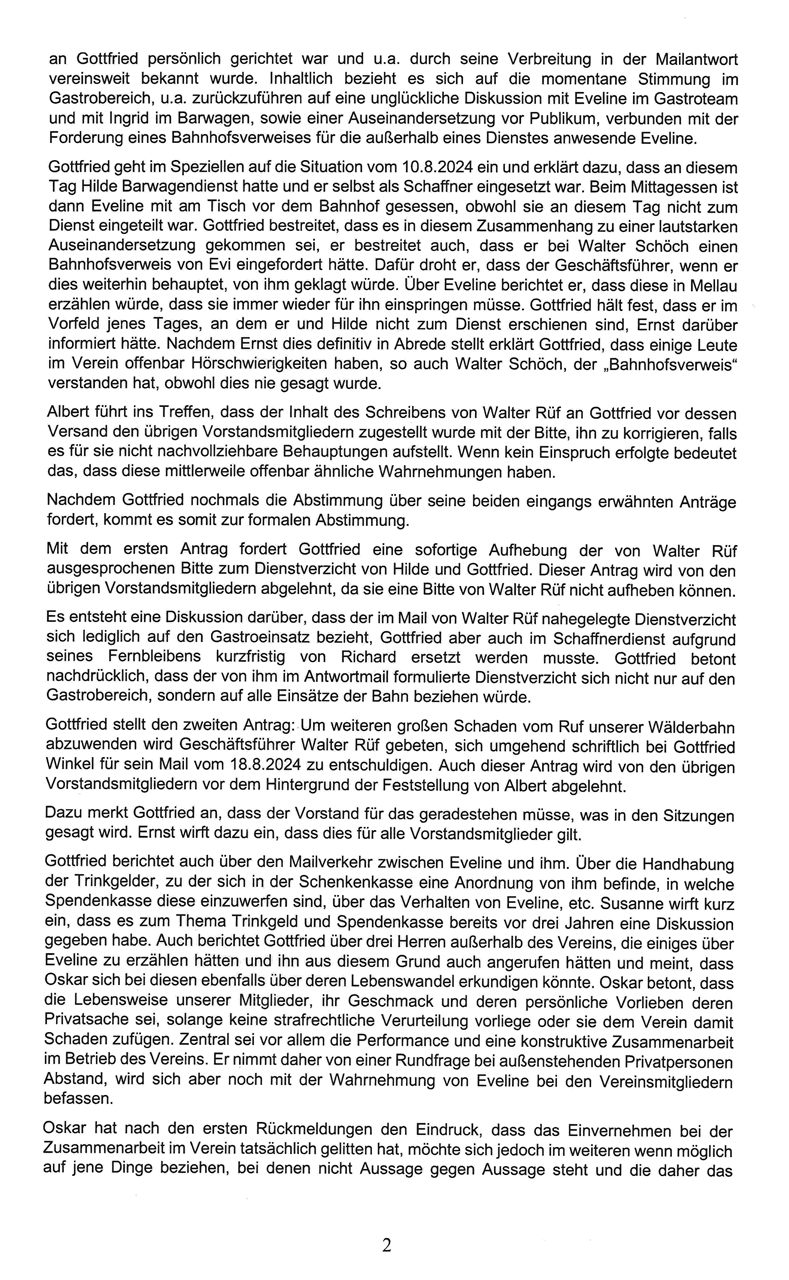 Um dieses Ziel zu erreichen, muss ich dich, Gottfried, auch wenn es nicht leichtfällt, bitten, ab sofort und bis auf weiteres von Einsätzen im Gastrobereich der Bregenzerwaldbahn-Museumsbahn Abstand zu nehmen. Es sollte in unserem gemeinsamen Interesse sein, dem Betrieb der mittlerweile erfreulich gut etablierten Museumsbahn keinen Schaden zuzufügen.